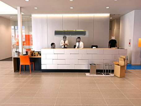 入口にあるコンシェルジュカウンター(別注)社員食堂壁塗り替え、ロビーソファの納品をさせて頂きました。